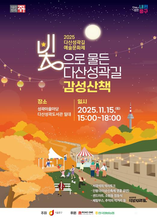 [뉴스노크=김인호 기자] 서울 중구는 오는 15일 오후 3시부터 6시까지 다산성곽도서관과 성곽마을마당 일대에서‘2025 다산성곽길 예술문화제’를 개최한다. 중구 역사홍보대사 방송인 서경석 씨의 역사특강부터 청춘인형극단의 인형극, 소망등 점등식, 미리보는 성곽길 감성가로 샌드아트 등 다채로운 프로그램이 가득하다.