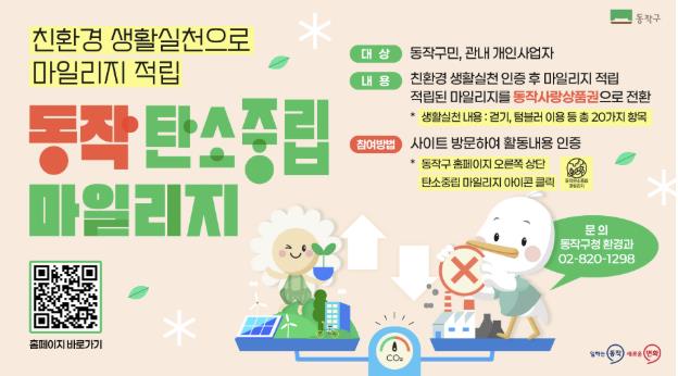 참여 대상은 동작구민 및 관내 소상공인으로 동작구청 누리집 또는 QR코드를 통해 탄소중립 마일리지 사이트에 접속한 후, 실천 내역을 인증하면 된다.