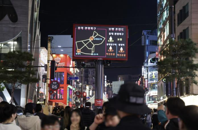 | ▲ 홍대 레드로드에 설치된 재난안전전광판에 인파 혼잡도 현황이 표출되고 있다. |
