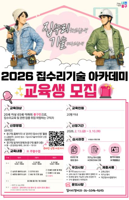 [뉴스노크=김인호 기자] 서울 중구가 일상 속 불편을 해결하는 집수리 기술을 배우고, 취업과 창업까지 이어질 수 있도록 돕는 '2026 집수리 기술 아카데미'를 운영한다.