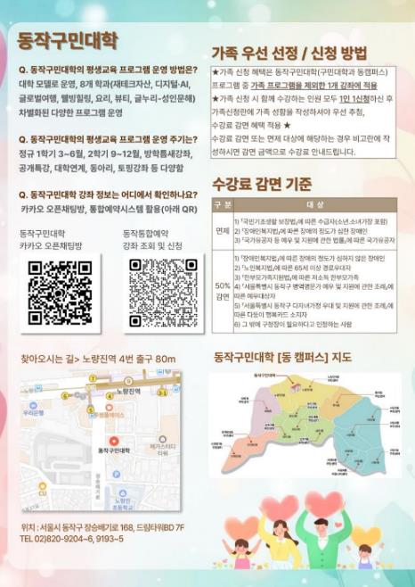 한편, 구민 접근성을 높이기 위해 운영하는 동 캠퍼스(신대방2동, 노량진2동 등 8개 주민센터)에서는 ▲부동산 재테크 전략 ▲생활 속 챗GPT 활용 ▲팝송으로 배우는 영어 ▲미식 클래스 ▲퍼스널컬러 스타일 코칭 등 차별화된 8개 프로그램을 마련했다.