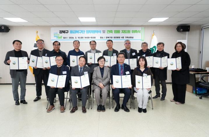 [뉴스노크=김인호 기자] 서울 강북구는 지난 10일 구청 기획상황실에서 ‘민간위험시설물 응급복구단 업무협약식’과 ‘건축 법률상담실 건축지도원 위촉식’을 개최해 재난 대응 역량 강화와 구민 권익 보호를 위한 민관 협력 기반을 한층 강화했다고 밝혔다.