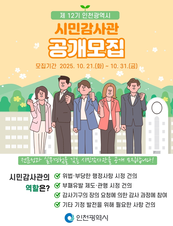 [뉴스노크=김인호 기자] 인천광역시는 제12기 시민감사관을 10월 21일부터 10월 31일까지 공개모집한다고 밝혔다.