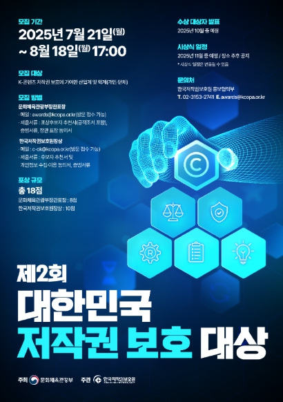 [뉴스노크=김인호 기자] 문화체육관광부는 한국저작권보호원과 함께 7월 21일부터 8월 18일까지 ‘제2회 대한민국 저작권 보호 대상’ 후보자에 대한 대국민 추천을 받는다.
