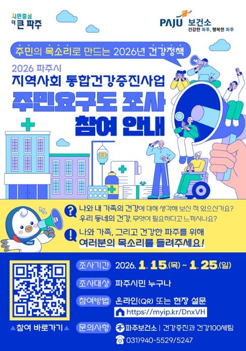 [뉴스노크=김인호 기자] 파주시는 시민의 건강한 삶을 지원하기 위해 '2026년 지역사회 통합건강증진사업’추진에 앞서 주민건강요구도 조사를 실시한다.