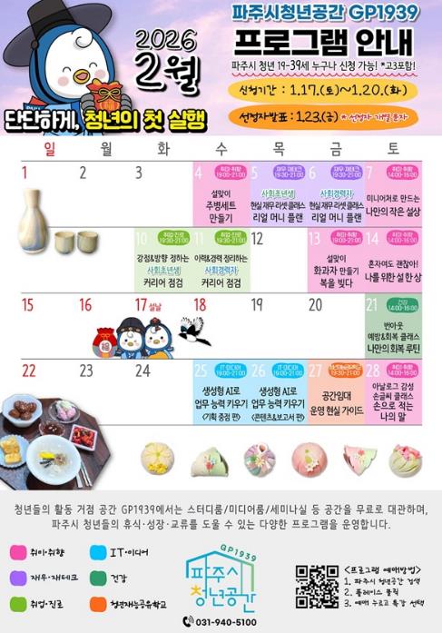 [뉴스노크=김인호 기자] 파주시청년공간 지피(GP)1939가 오는 2월 한 달간 청년을 위한 맞춤형 프로그램에 참여할 참여자를 모집한다.