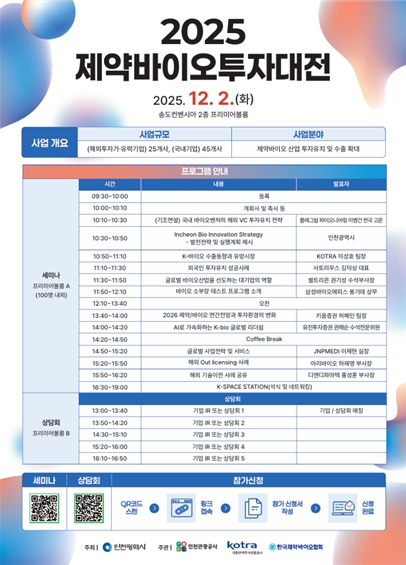 [뉴스노크=김인호 기자] 인천광역시가 주최하고 인천관광공사와 KOTRA, 한국제약바이오협회가 공동 주관하는 ‘제약바이오투자대전’이 오는 12월 2일 인천 송도컨벤시아 프리미어볼룸에서 열린다.