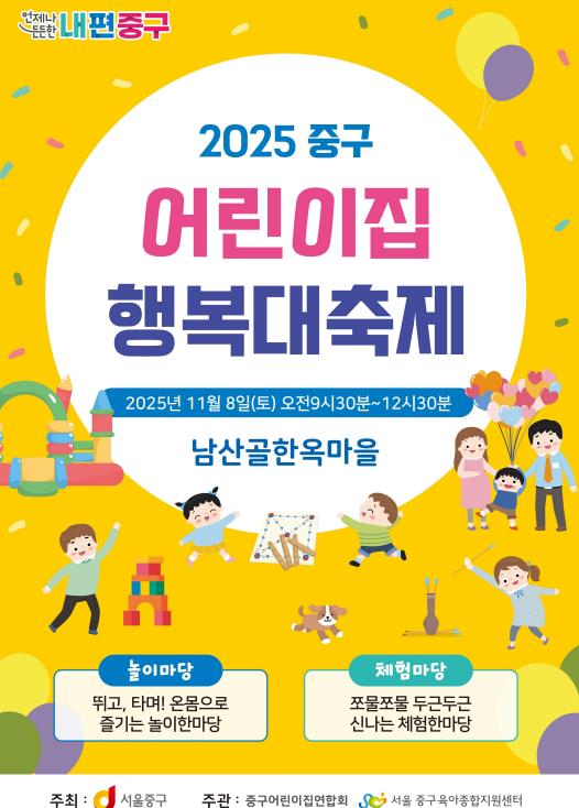 [뉴스노크=김인호 기자] 서울 중구는 오는 11월 8일 토요일 오전 9시 30분부터 12시 30분까지 남산골 한옥마을 천우각 광장 일대에서 '2025 중구어린이집 행복대축제'가 개최된다고 밝혔다.