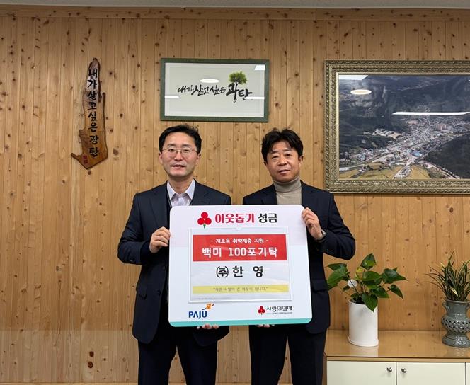 | ▲ 파주시 광탄면, ㈜한영으로부터 300만 원 상당 백미 100포 전달받아 |