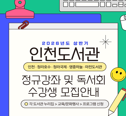 [뉴스노크=김인호 기자] 인천광역시 인천도서관 및 분관(청라호수·청라국제·영종하늘·마전도서관)은 오는 3월부터 2026년 상반기 정규강좌 프로그램을 운영한다고 밝혔다.