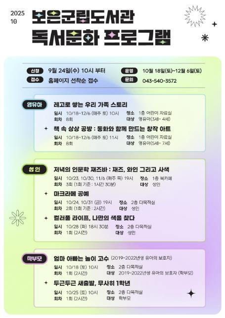 [뉴스노크=김인호 기자] 보은군립도서관은 오는 24일 오전 10시부터 ‘2025년 하반기 프로그램’ 수강생 모집에 들어간다. 이번 프로그램은 유아, 성인, 부모 등 다양한 계층을 대상으로 총 7개 강좌가 마련됐다.