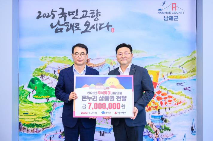 [뉴스노크=김인호 기자] 남해군은 지난 30일 BNK경남은행 남해지점이 추석 명절을 앞두고 700만원 상당의 온누리상품권을 기탁했다고 밝혔다.