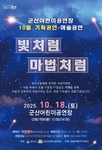[뉴스노크=김인호 기자] 군산어린이공연장이 오는 10월 18일 어린이들의 상상력과 창의력을 자극하는 특별한 체험형 공연 '빛처럼 마법처럼'을 선보인다.