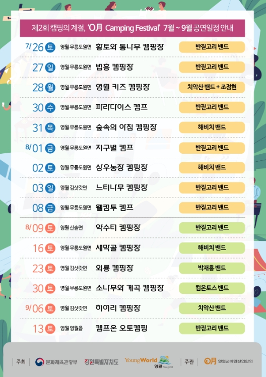 [뉴스노크=김인호 기자] 영월군과 영월군야영장연합회는 7월 26일부터 9월 13일까지 영월군 관내 캠핑장 15곳에서 “제2회 영월 캠핑 페스티벌(0月 Camping Festival)”을 개최한다.