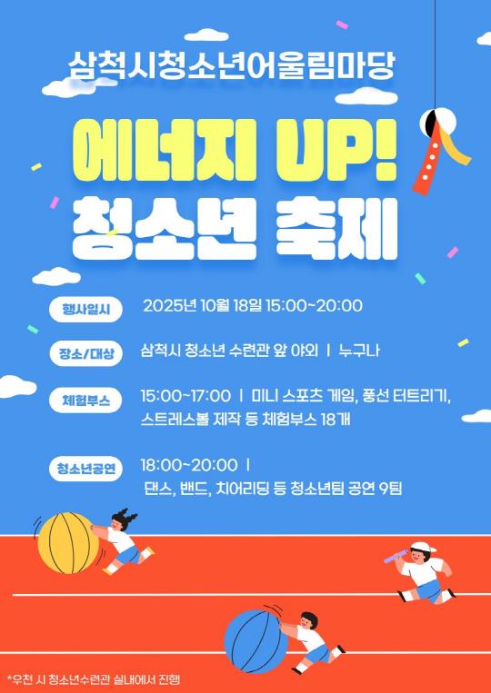 [뉴스노크=김인호 기자] 삼척시청소년수련관은 오는 10월 18일 오후 3시부터 관내 청소년과 가족을 대상으로 2025 삼척시청소년어울림마당 『에너지 UP! 청소년축제』를 개최한다.