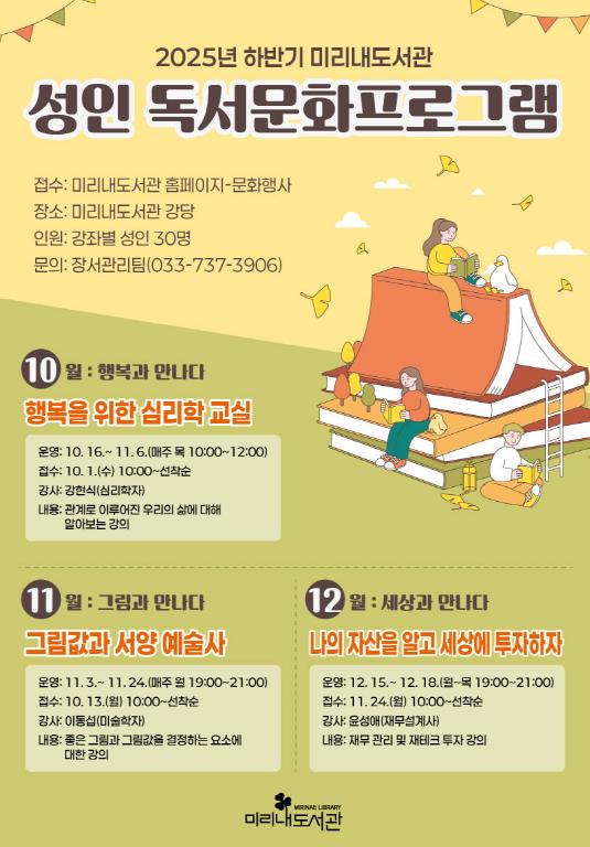 [뉴스노크=김인호 기자] 원주시 미리내도서관은 지역 시민들의 문화적 접근성을 높이기 위해 성인을 대상으로 하반기 독서문화프로그램을 운영한다.