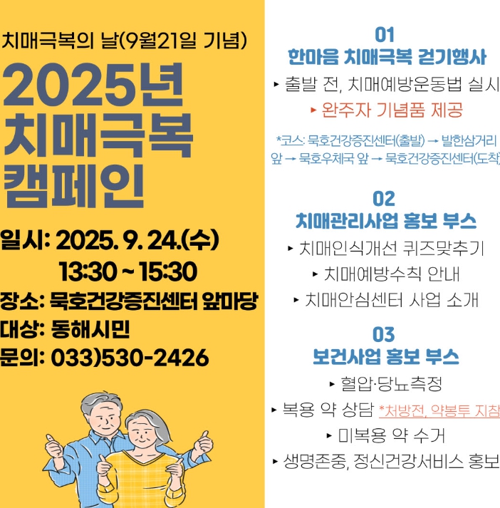 [뉴스노크=김인호 기자] 동해시는 2025년 치매극복의 날(9월 21일)을 맞아 치매에 대한 인식개선과 예방·관리의 중요성을 널리 알리기 위해 오는 9월 24일 오후 1시 30분 묵호건강증진센터 앞마당에서 기념 캠페인을 개최한다.
