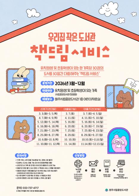 [뉴스노크=김인호 기자] 원주시립중앙도서관은 3월부터 우리집 작은도서관 ‘책드림 서비스’를 운영한다.