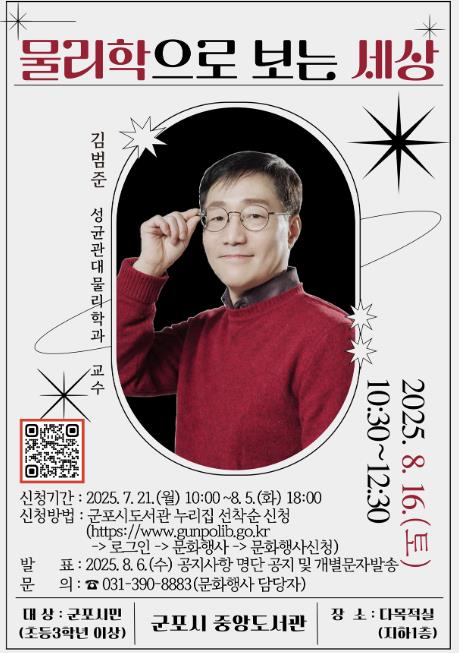 [뉴스노크=김인호 기자] 군포시 중앙도서관은 여름방학을 맞아 오는 8월 16일 토요일, 가족이 함께 즐길 수 있는 특별한 과학 강연 '물리학으로 보는 세상'을 개최한다.