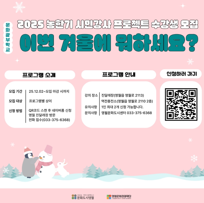 [뉴스노크=김인호 기자] (재)영월문화관광재단은 2025 문화 광부학교 농한기 시민 강사 프로젝트 수강생을 12월 2일부터 모집한다고 밝혔다.