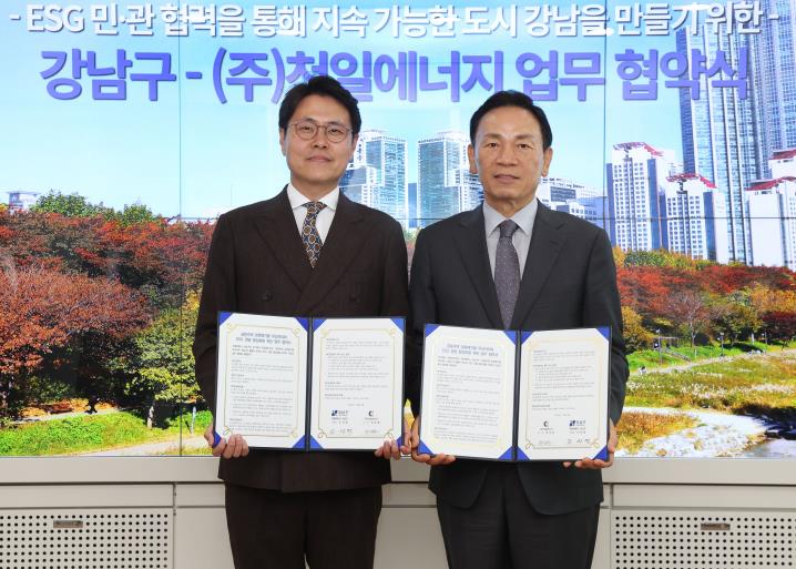 | ▲ 업무협약식_조성명 강남구청장(오른쪽), 박상원 (주)천일에너지 대표(왼쪽) |