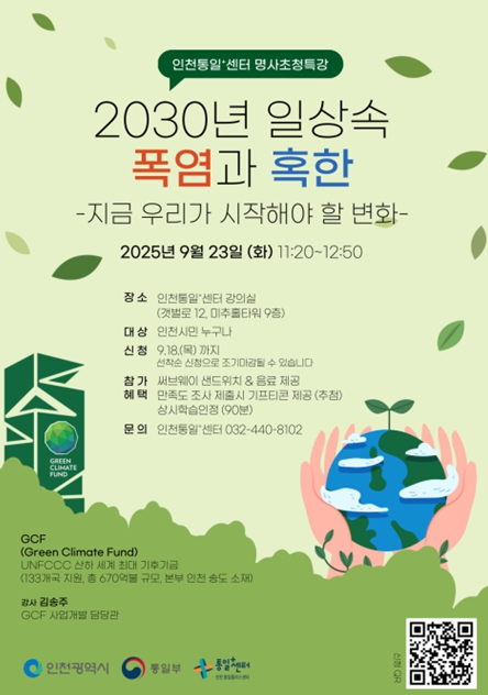 [뉴스노크=김인호 기자] 인천광역시는 9월 23일 인천통일플러스센터(연수구 송도동 소재)에서 녹색기후기금(GCF)의 전문가를 초청, 기후위기의 심각성과 대응방안을 주제로 하는 특별 강연을 개최했다고 밝혔다.