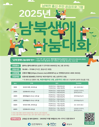 이번 프로그램은 인천통일플러스센터 주관으로 진행되며, 북한이탈주민과 지역 주민이 각자의 생애를 진솔하게 이야기하며 공통점과 차이점을 이해하는 과정을 통해 지역사회 통합과 포용 문화 확산을 목표로 한다.