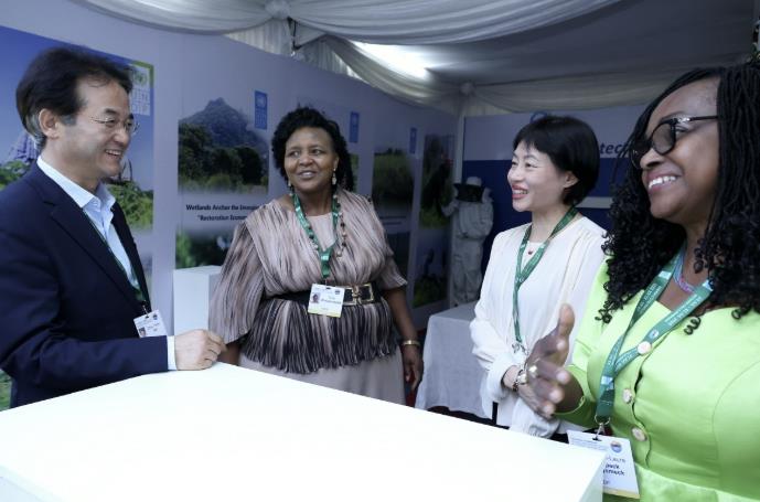▲ 유엔개발계획(UNDP) 참가부스를 방문해 습지보전에 대한 국제적 연대를 강조한 이동환 고양특례시장(왼쪽부터 이동환 고양특례시장, 울라우우나셰(Wulawunashe), 이 류(Yi Liu), 마리-로르 음펙 니에(Marie-Laure Mpeck Nyemeck)) |