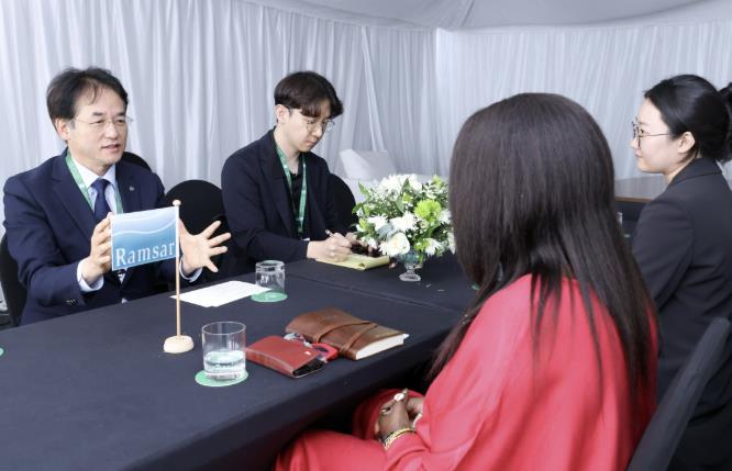 ▲ 무손다 뭄바(Musonda Mumba) 람사르협약 사무총장에게 장항습지의 국제적 가치와 고양시의 습지 보전정책을 설명하며, 람사르 사무국과의 협력 강화를 제안하는 이동환 고양특례시장 |