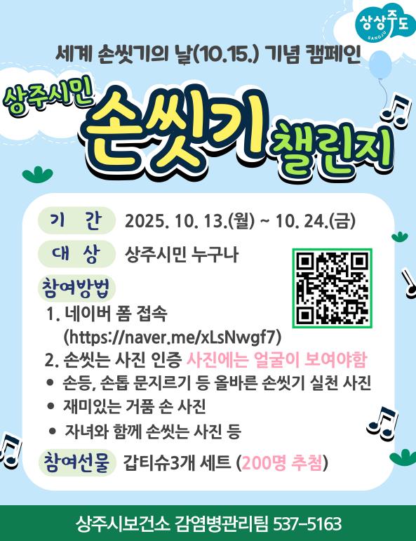 이번 캠페인은 감염병 예방을 위한 올바른 손씻기 실천을 장려하고, 시민들의 생활 속 위생 습관 개선을 위해 마련됐으며 상주시민 누구나 참여할 수 있다.