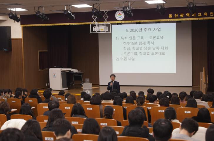 | ▲ 천창수 교육감이 10일 울산교육연수원에서 초중등 신규 임용 예정자들에게 올해의 주요사업을 전달하고 있다 |