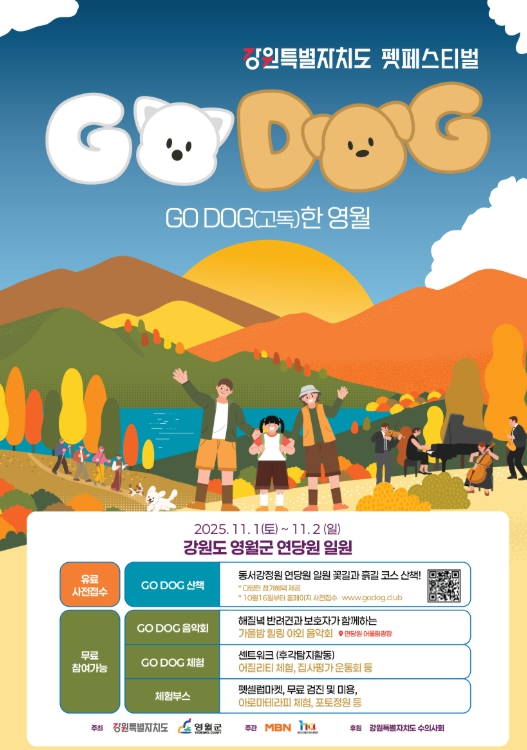 [뉴스노크=김인호 기자] 강원특별자치도와 영월군이 주최하고 MBN과 HA인터렉션이 주관하는 ‘고독(GO DOG)한 영월’ 펫 페스티벌이 11월 1일부터 11월 2일까지 동서강정원 연당원에서 열린다.