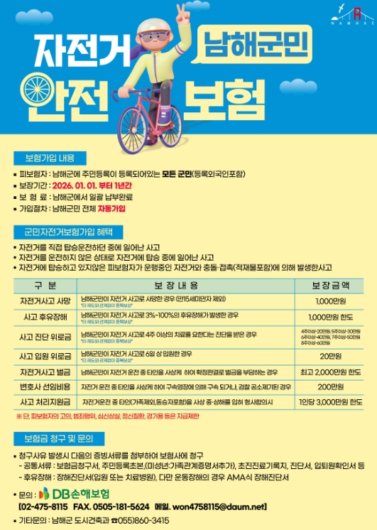 [뉴스노크=김인호 기자] 남해군은 2026년에도 ‘남해군민 자전거안전보험’ 제도를 운영한다.