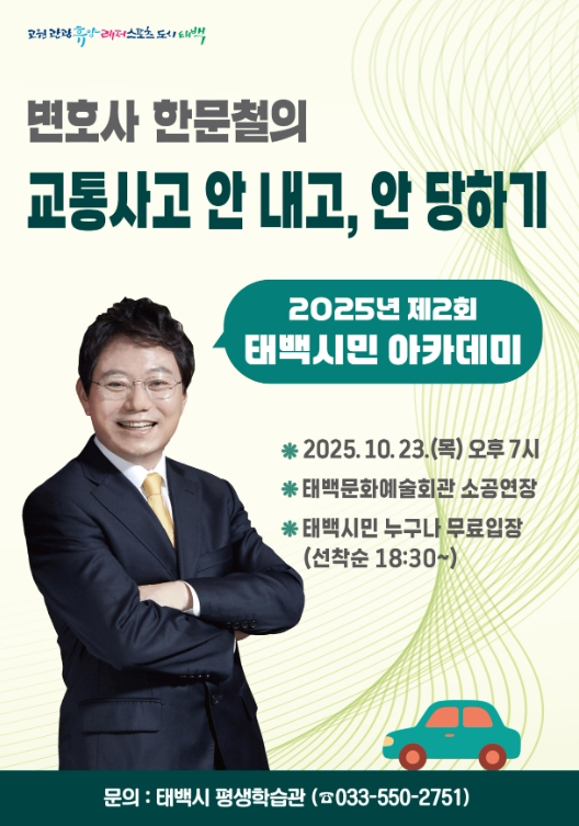 [뉴스노크=김인호 기자] 태백시는 시민들의 교통안전 의식을 높이고 사고 예방 문화를 확산하기 위해 오는 23일 오후 7시, 태백문화예술회관 소공연장에서 ‘제2회 태백시민 아카데미’를 개최한다고 밝혔다.