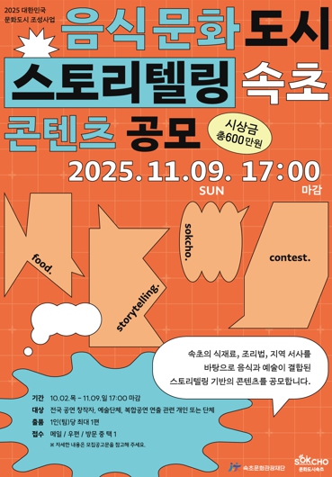 이병선 속초문화관광재단 이사장은 “속초의 음식은 한 끼의 식사를 넘어, 우리 현대사의 아픔과 희망, 그리고 강인한 생명력을 품고 있는 살아있는 문화유산”이라며 “이번 공모를 통해 잠들어있던 소중한 이야기들이 창의적인 예술가의 손에서 생명을 얻어, 세대를 넘어 깊은 공감과 감동을 주는 콘텐츠로 재탄생하길 기대한다”고 말했다.
