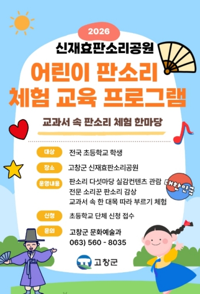 아울러 이번 사업은 전국 단위 초등학생 대상 체험 교육 운영을 통해 고창군을 전통문화 기반 현장 체험학습 거점 지역으로 홍보하고, 지역 문화자원의 교육적 활용 가치를 확산하는 계기가 될 것으로 기대되고 있다.