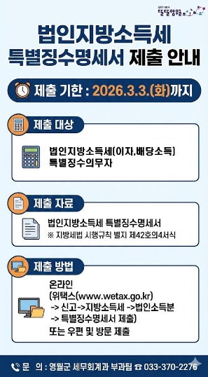 [뉴스노크=김인호 기자] 영월군은 법인지방소득세 이자‧배당소득 특별징수의무자를 대상으로 3월 3일까지 특별징수명세서를 제출해야 한다고 밝혔다.