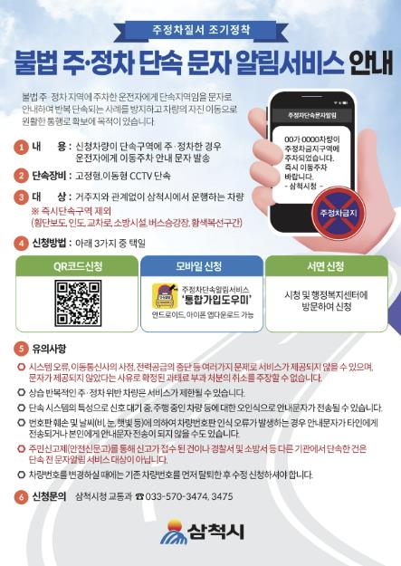 [뉴스노크=김인호 기자] 삼척시가 불법 주·정차 위반 차량에 대해 사전 문자 안내를 제공하는 ‘주·정차 단속 문자알림 서비스’를 8월 11일부터 본격 시행한다.