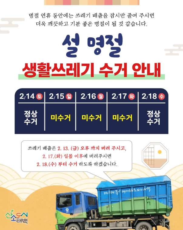 태백시는 “설 연휴 기간 중 생활쓰레기 배출은 최대한 자제하고, 반드시 지정된 수거일에 맞춰 배출해 주시길 바란다”며 “시민 여러분의 협조가 쾌적한 명절 환경 조성에 큰 도움이 된다”고 당부했다.