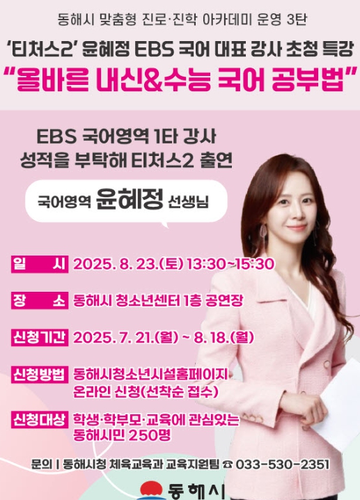 [뉴스노크=김인호 기자] 동해시는 오는 8월 23일, EBS 국어 영역 일타강사 윤혜정 강사를초청하여 국어 학습법 특강을 개최한다고 밝혔다.