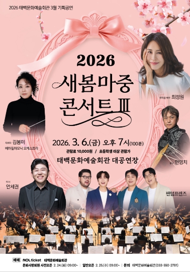 태백문화예술회관 관계자는 “새봄마중 콘서트Ⅲ는 클래식과 뮤지컬, 국악이 어우러진 특별한 무대로 봄의 시작을 알리는 의미 있는 공연이 될 것”이라며 “시민 여러분께서 가족과 함께 공연장을 찾아 따뜻한 음악으로 새봄을 맞이하시길 바란다”고 전했다.