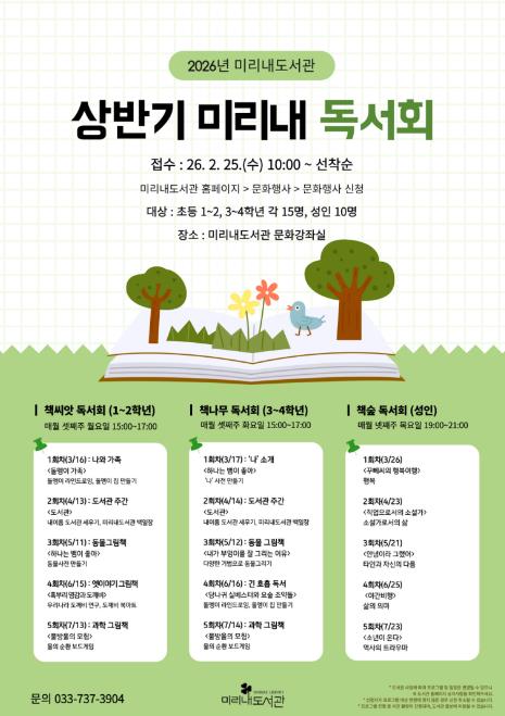 참여 신청은 2월 25일 오전 10시부터 도서관 홈페이지를 통해 선착순으로 접수한다. 자세한 사항은 미리내도서관 장서관리팀으로 문의하면 된다.