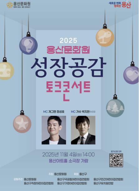 [뉴스노크=김인호 기자] 서울 용산구는 오는 11월 4일 오후 2시, 용산아트홀(녹사평대로 150) 소극장 가람에서 ‘성장공감 토크콘서트’를 개최한다. 이번 행사는 용산문화원이 주관하고 용산구가 후원한다.