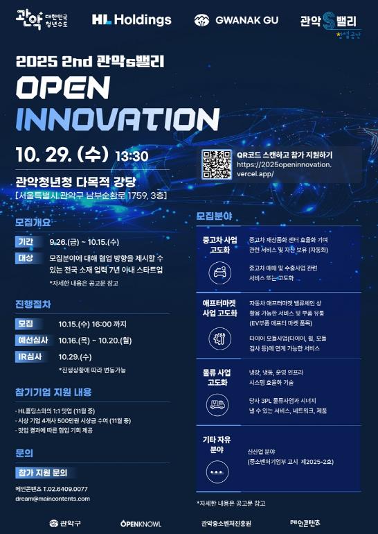 [뉴스노크=김인호 기자] 관악구가 자동차, 물류 분야 글로벌 네트워크를 보유한 ‘HL홀딩스’와 함께 ‘2025 제2회 관악S밸리 오픈 이노베이션’에 참가할 기업을 모집한다.