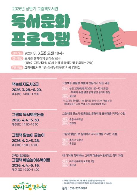 3월 28일부터 6월 20일까지 ▲책놀이지도사 2급(성인) ▲그림책 독서토론논술(초등 4∼6학년) ▲그림책 말놀이 글놀이(초등 2·3학년) ▲가족이 함께하는 그림책 예술놀이&북아트(유아 6·7세 및 보호자) 등 총 4개 강좌가 운영된다.