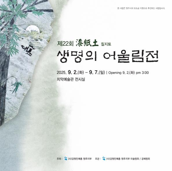 [뉴스노크=김인호 기자] (사)강원민예총 원주지부는 9월 2일 치악예술관 전시실에서 제22회‘칠지토(漆紙土) 생명의 어울림전’개막식을 개최한다. 전시는 9월 7일까지 이어지며, 누구나 무료로 관람할 수 있다.