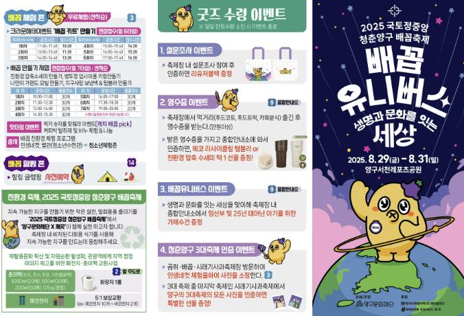 배꼽축제 굿즈 수령 이벤트로 축제장 내 설문조사시 리유저블백을 증정하고 곰취축제, 배꼽축제, 시래기사과축제를 모두 방문한 방문객들에게 특별한 선물을 증정하는‘청춘양구 3대 축제 이벤트’도 진행된다.