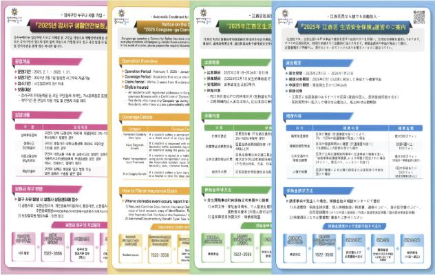 [뉴스노크=김인호 기자] 서울 강서구는 ‘생활안전보험’ 안내문을 한국어, 영어, 중국어, 일본어 4개 국어로 제작했다고 밝혔다.