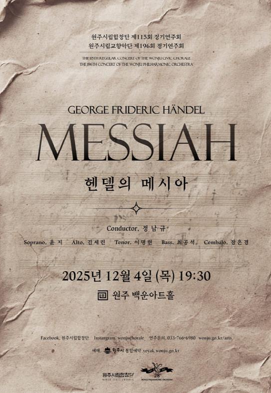 [뉴스노크=김인호 기자] 원주 시립합창단과 시립교향악단은 오는 12월 4일 오후 7시 30분 백운아트홀에서 정기연주회 ‘헨델의 메시아’를 개최한다.