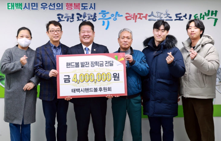 [뉴스노크=김인호 기자] 태백시는 태백시핸드볼후원회(회장 우병선)가 지역 핸드볼 꿈나무 육성을 위해 총 400만 원 규모의 핸드볼 발전 장학금을 관내 4개 학교(황지초등학교, 세연중학교, 황지정보산업고등학교, 철암고등학교)에 전달했다고 밝혔다.